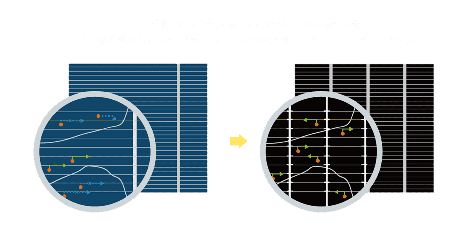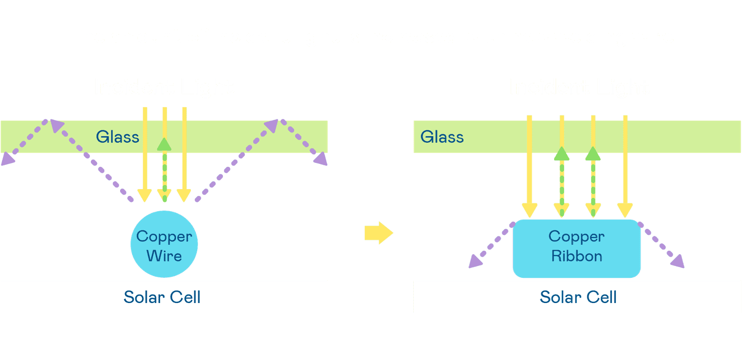 - 电池使用多条铜导线 (Copper wire) 于电池片上形成较短的电流路径,,,提高电流收集效率,,,,采用圆形设计的铜导线较传统扁平式的铜焊带 (Ribbon),,,可增加入射至电池的光线量。。