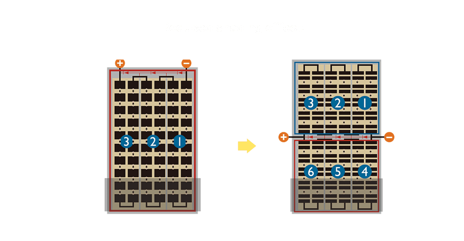 - 结合半切电池,,,,降低遮阴影响、、、、提升模组抗隐裂能力、、、并减少电阻损耗,,,,进一步提升模组发电效能。。。。